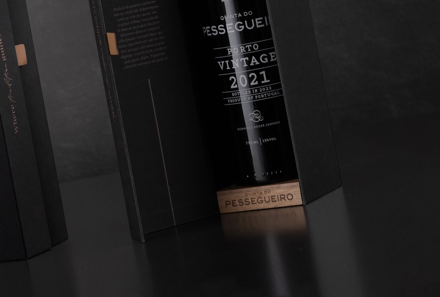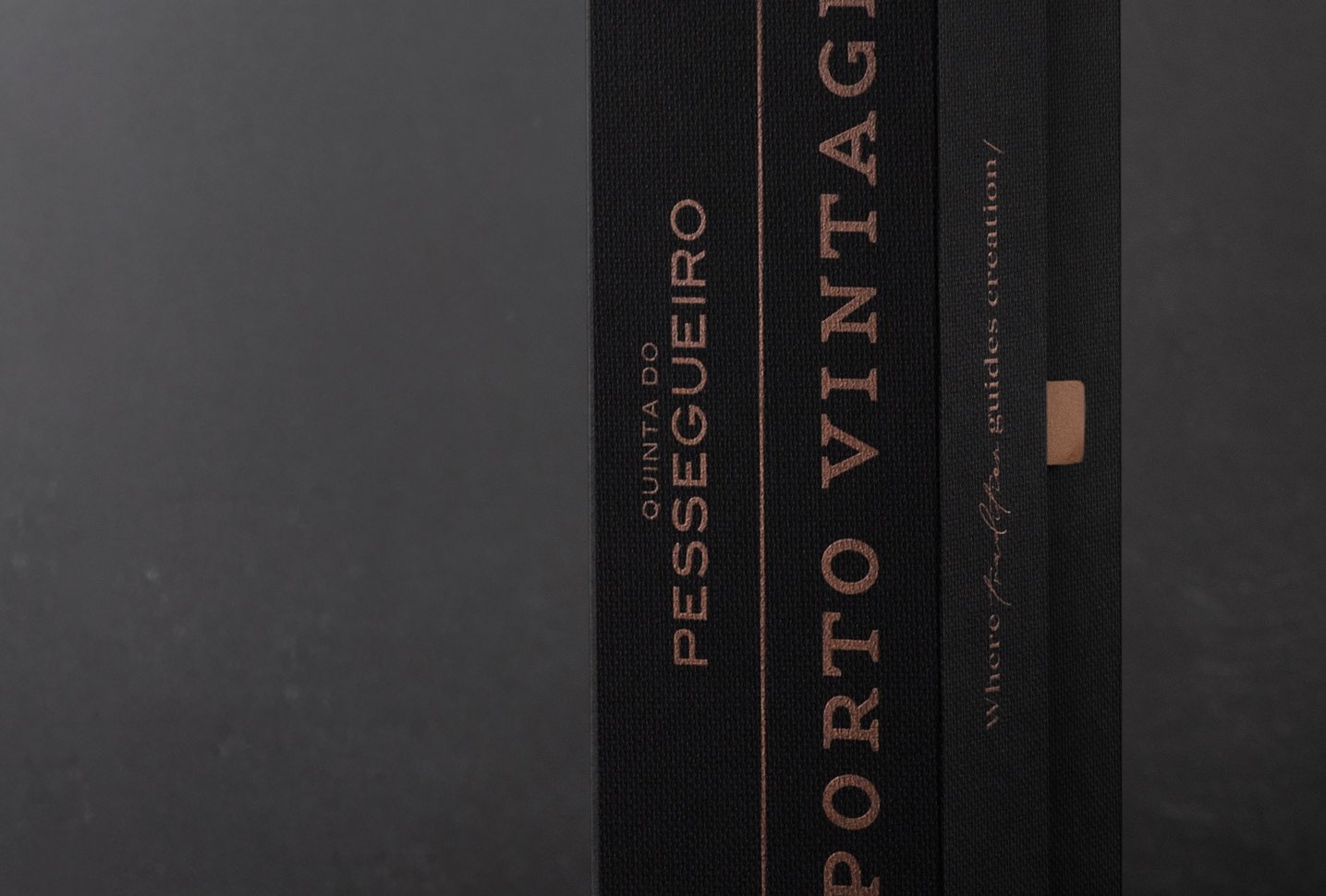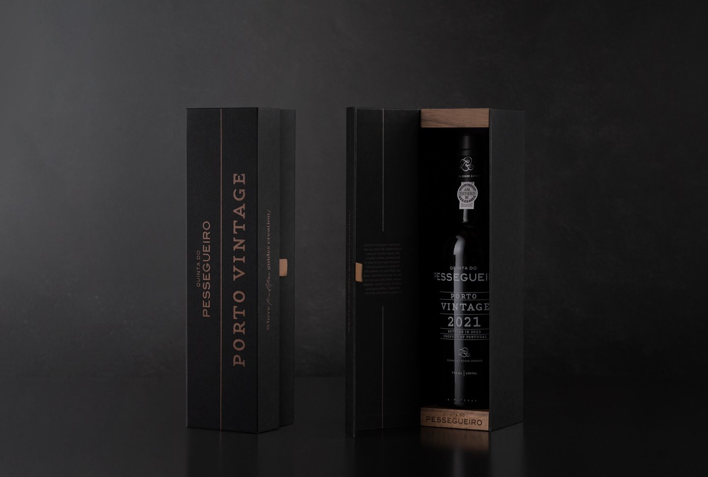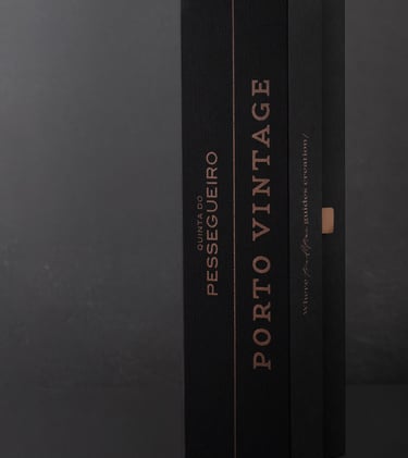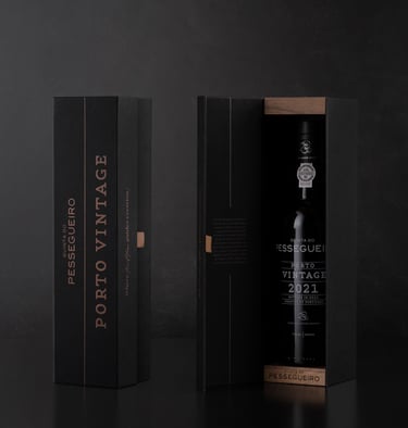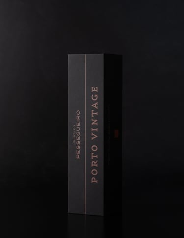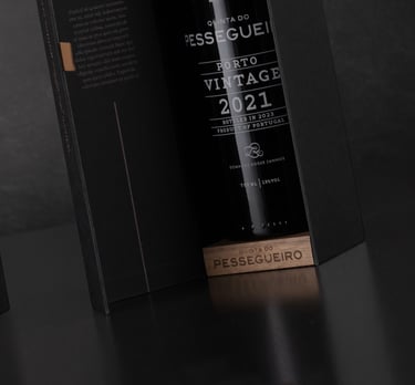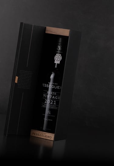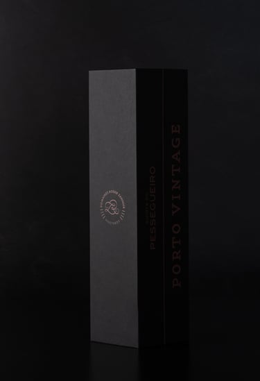 Envolto pela elegância do tom preto, o Porto Vintage 2021 da Quinta do Pessegueiro é apresentado numa embalagem que une a sofisticação da tradição aos materiais autênticos. A imitação de tecido da Fedrigoni Imitlin, com sua trama bem vincada, evoca a robustez da terra, enquanto os grafismos em bronze alaranjado capturam a essência do Douro e as suas tradições, uma alusão ao tempo e ao estágio. A pega de abertura em pele e os topos em madeira de nogueira com gravação a fogo são o reflexo de um cuidado meticuloso e do compromisso com a simplicidade refinada. Uma obra que vai além da embalagem, valorizando o vinho e a sua história.