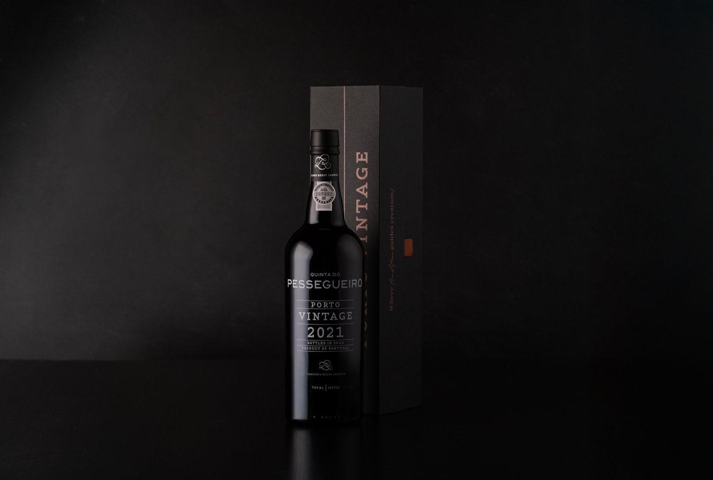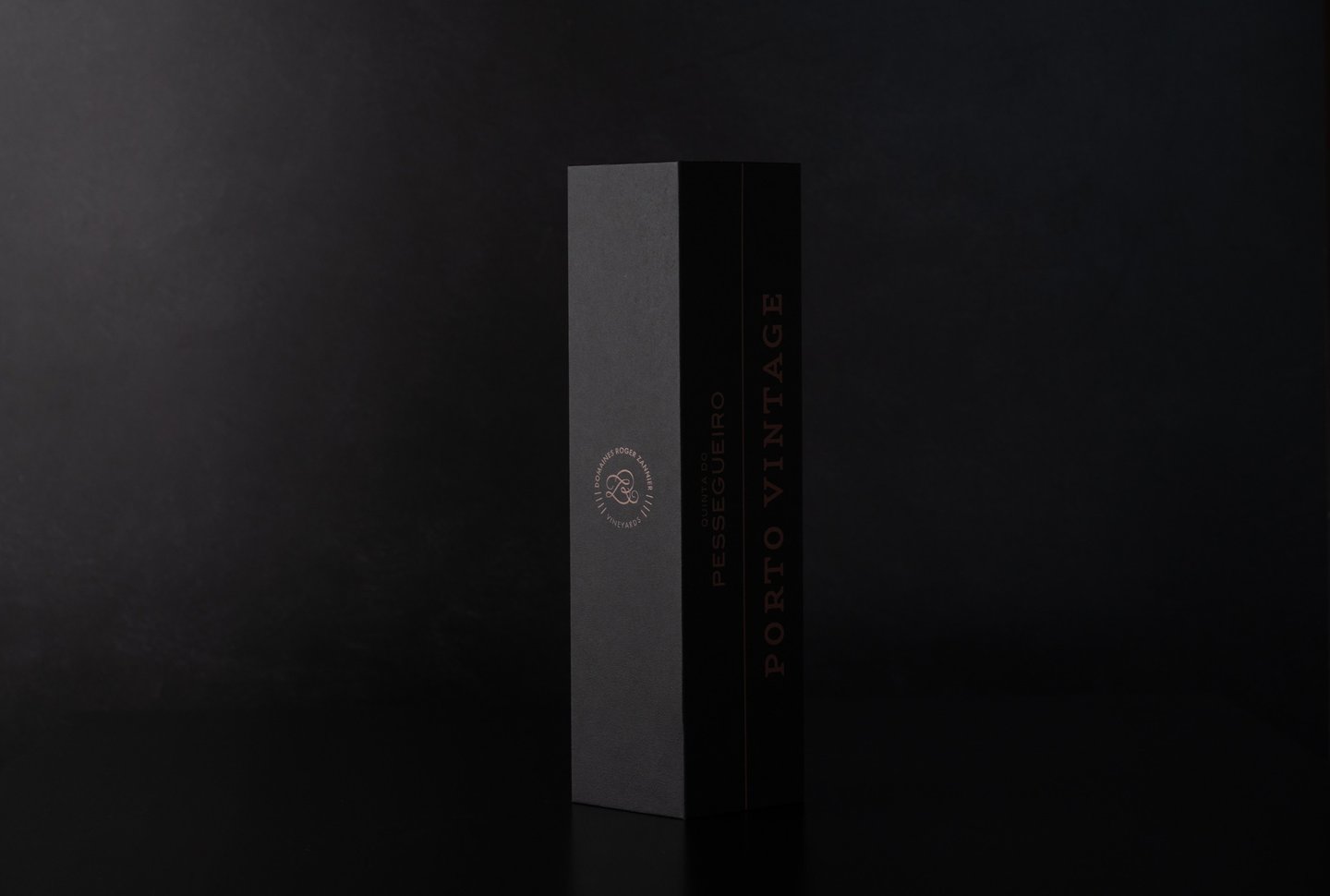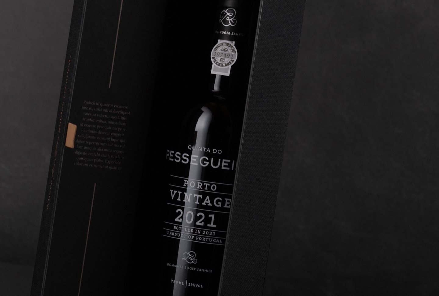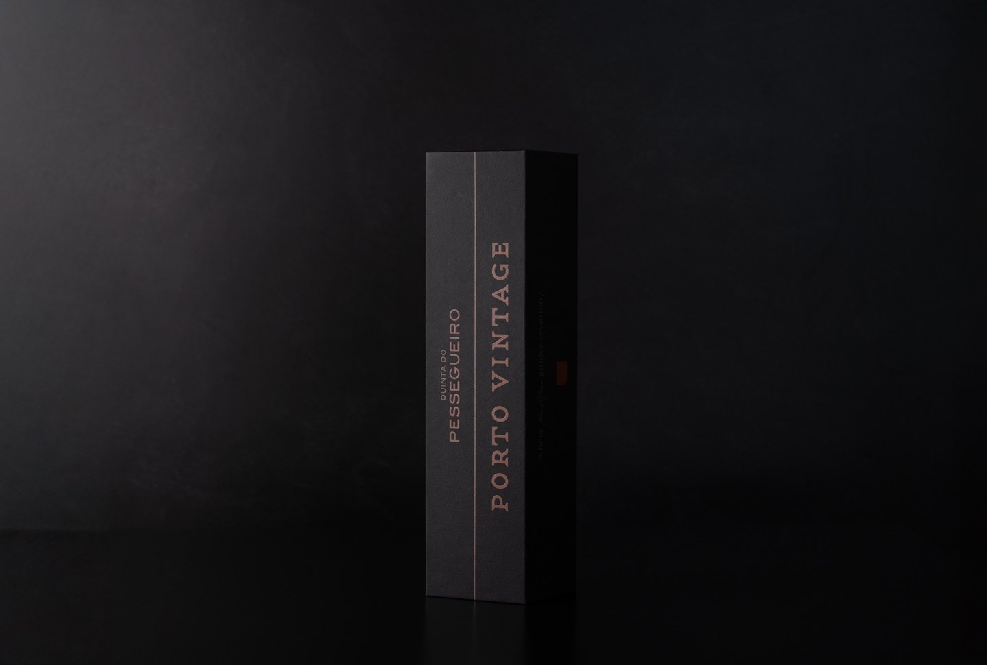 Envolto pela elegância do tom preto, o Porto Vintage 2021 da Quinta do Pessegueiro é apresentado numa embalagem que une a sofisticação da tradição aos materiais autênticos. A imitação de tecido da Fedrigoni Imitlin, com sua trama bem vincada, evoca a robustez da terra, enquanto os grafismos em bronze alaranjado capturam a essência do Douro e as suas tradições, uma alusão ao tempo e ao estágio. A pega de abertura em pele e os topos em madeira de nogueira com gravação a fogo são o reflexo de um cuidado meticuloso e do compromisso com a simplicidade refinada. Uma obra que vai além da embalagem, valorizando o vinho e a sua história.